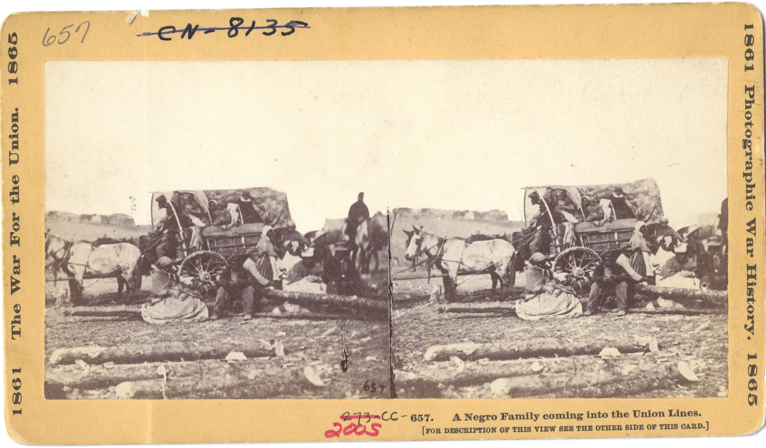 Original caption: A characteristic view of a big load of "contrabands" coming into our lines. Photo shows African American men, women, and children seated in front of and inside a mule-drawn covered wagon. Artist Alfred Waud worked up a sketch from this photograph, probably made in his presence by David B. Woodbury on January 1, 1863. The drawing, called "An arrival in Camp--under the Proclamation of Emancipation" was published in Harper's WeeklyThis repeated image was first captured in a photo by Matthew Brady's operator David B. Woodbury. Woodbury depicts a group of people arriving in a horse-drawn wagon, including men, women, and children who were likely former slaves. Newspaper artist Alfred Waud modified Woodbury's drawing while he was out in the field sketching it. Waud's figures were dressed more tastefully, with one man sporting an umbrella and a satin hatband. This sketch, which Waud frequently published in Harper's Weekly, appeared there in January 1863. The identical incident was depicted in The New York Illustrated News (not seen here) in a way that neither matched Woodbury's photograph nor Waud's illustrations. This incident was once more reenacted by Milton Bradley's Myriopticon toy, this time for amusement in the family living room.